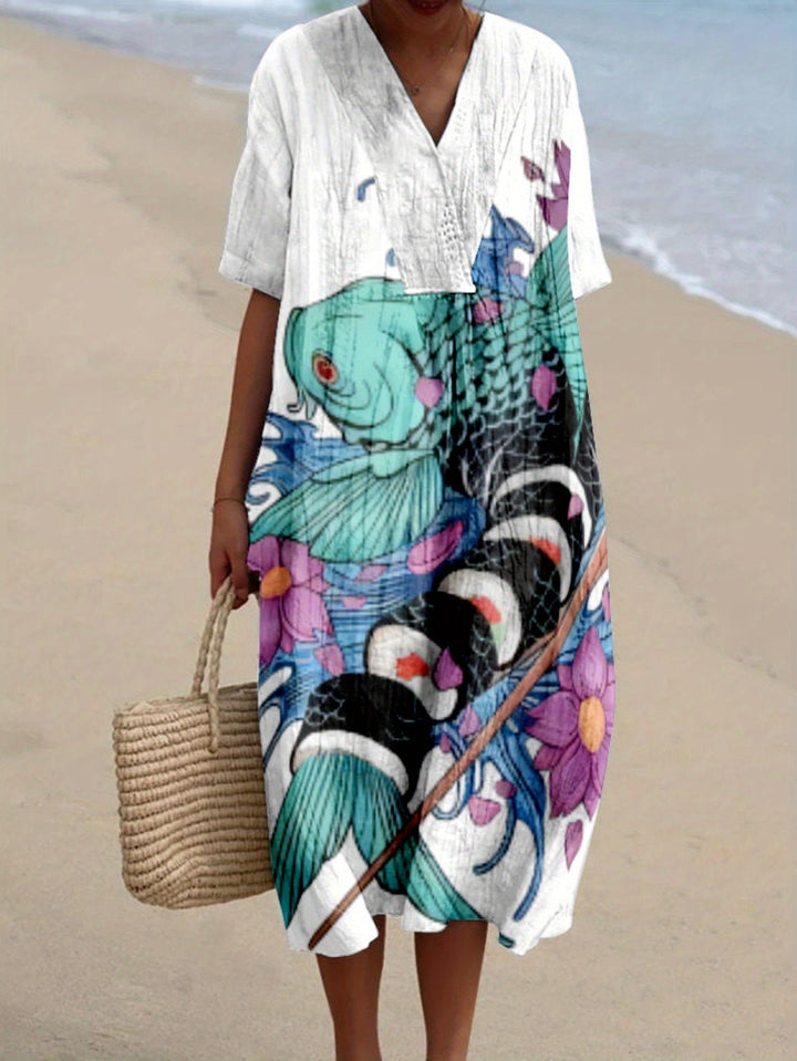 El vestido Ariadna combina un estampado vibrante con un corte fluido que se adapta perfectamente a cualquier silueta. Ideal para mujeres seguras que disfrutan vestir con personalidad.