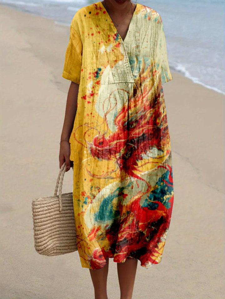 El vestido Isabel destaca por su elegante estampado que combina tonos suaves y vibrantes, junto con un corte cómodo y fluido. Una prenda pensada para mujeres que buscan sentirse frescas, únicas y con estilo, sin sacrificar la comodidad.